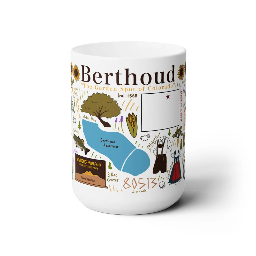 This Berthoud, Colorado-themed mug captures the quaint charm of this lovely town. It features vibrant illustrations of Berthoud’s notable landmarks, such as Waggener Farm Park, Berthoud Bike Park, the Berthoud Reservoir and more local highlights.