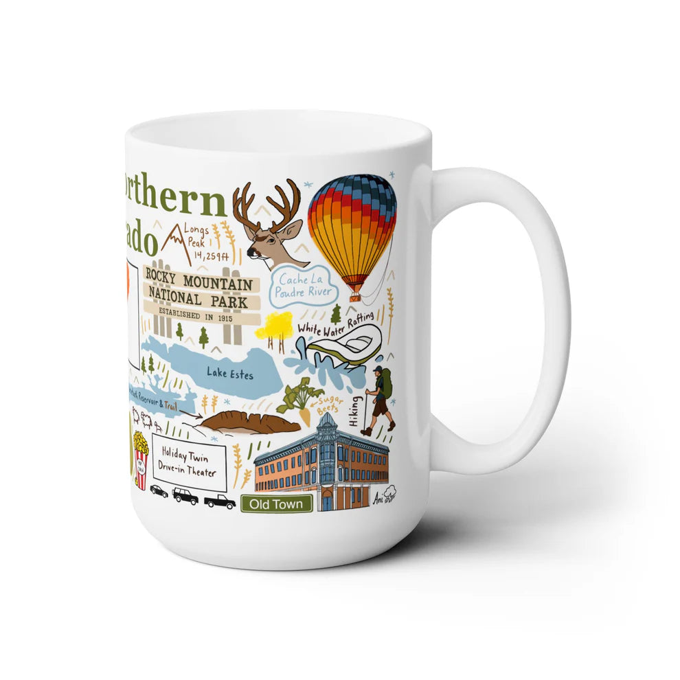 This Northern Colorado-themed mug celebrates the diverse beauty and vibrant communities that define the region. It features colorful illustrations of scenic mountain views, expansive plains, and iconic towns like Fort Collins, Greeley, Estes Park and Loveland.
