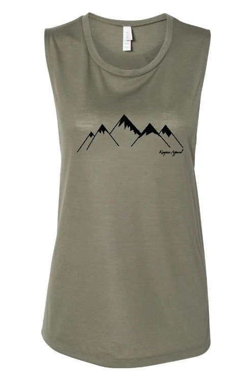 Mountain Olive Green poly-cotton blend women's tank, locally designed and screen printed logo that celebrates mountain life. Super soft and comfortable.